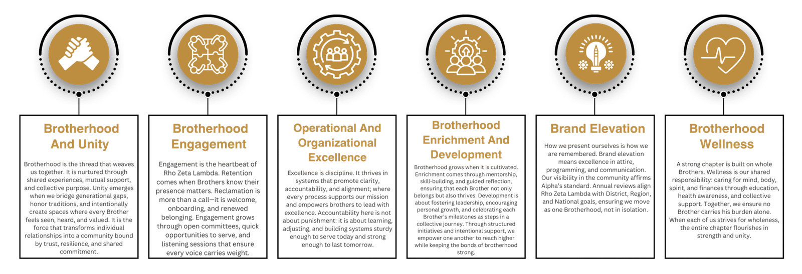 How we present ourselves is how we are remembered. Brand elevation means excellence in attire, programming, and communication. Our visibility in the community affirms Alpha’s standard. Annual reviews align Rho Zeta Lambda with District, Region, and National goals, ensuring we move as one Brotherhood, not in isolation.
